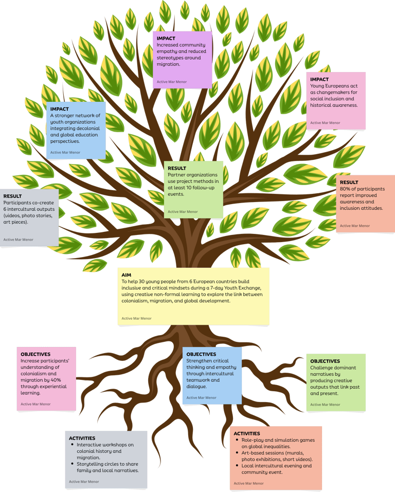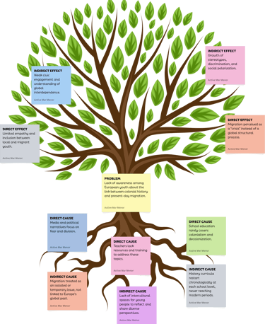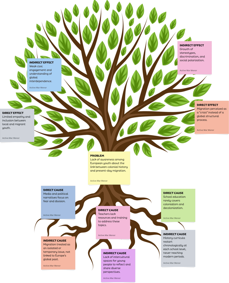 The problem tree shows how the lack of education about Europe’s colonial past leads to misunderstanding migration and weak inclusion. By addressing these roots through non-formal learning, young people can build empathy, critical thinking, and shared responsibility for a more inclusive Europe.