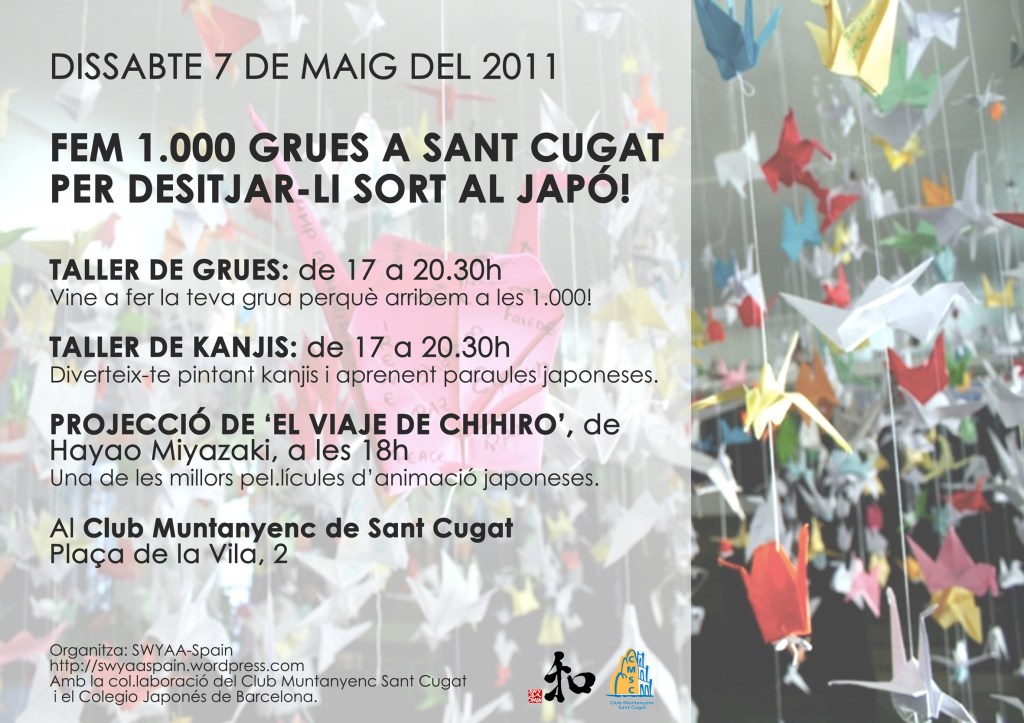 SWYAA Spain, como tantas otras organizaciones vinculadas a Japón, se movilizó para ayudar a los afectados por el terremoto y posterior tsunami que afectó a la costa oriental del país. Nuestra compañera Mireia Janue tuvo un papel muy activo en la actividad organizada en Sant Cugat del Vallès con el Colegio Japonés de Barcelona. Se elaboraron miles de grullas de papiroflexia en recuerdo de las víctimas y como forma de apoyo simbólico a los afectados.